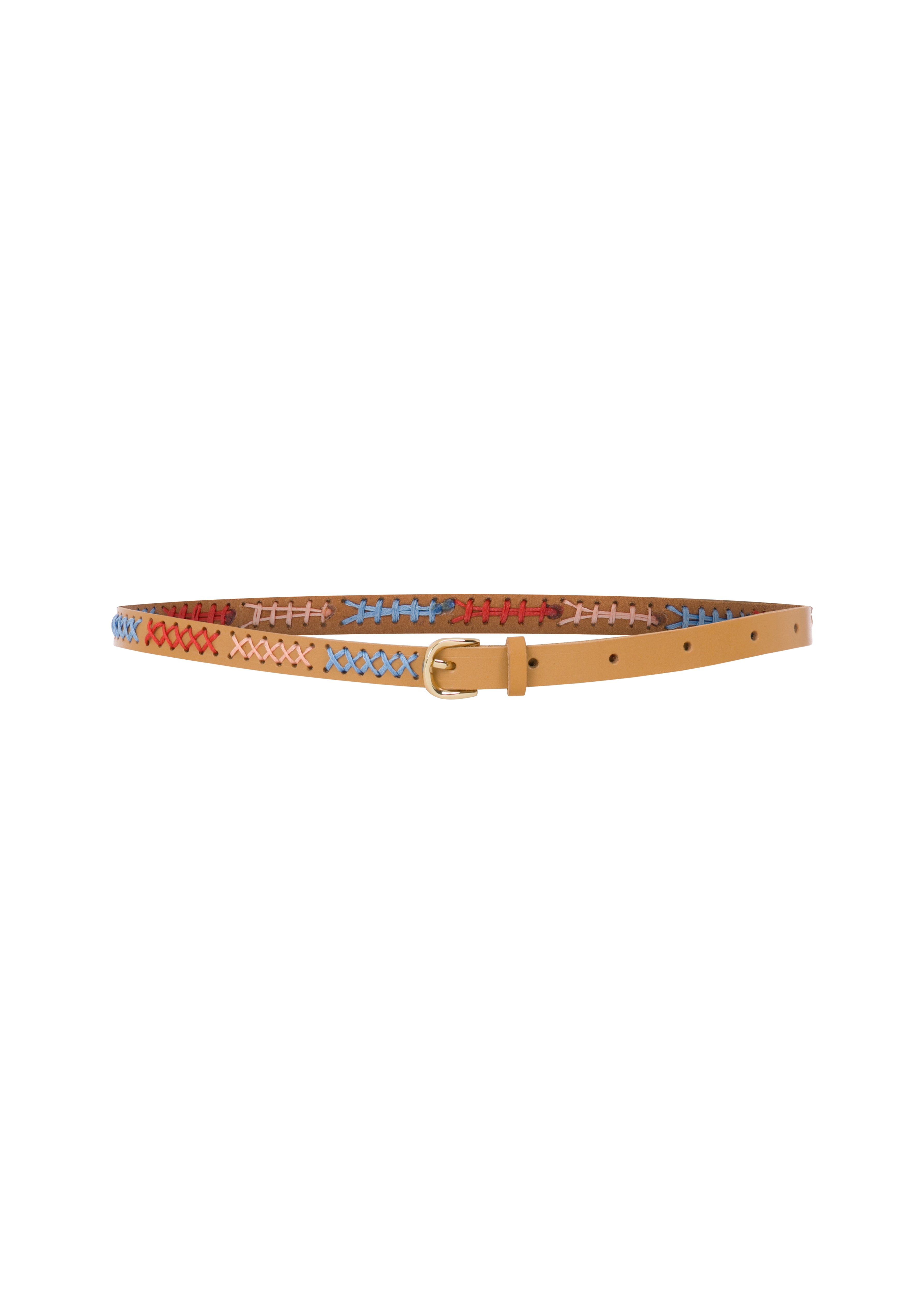 A slim leather belt adorned with signature Lug Von Siga cross-stitch embroidery in earthy tones. Crafted with precision, it’s a subtle nod to heritage—designed to cinch the waist with character and grace.