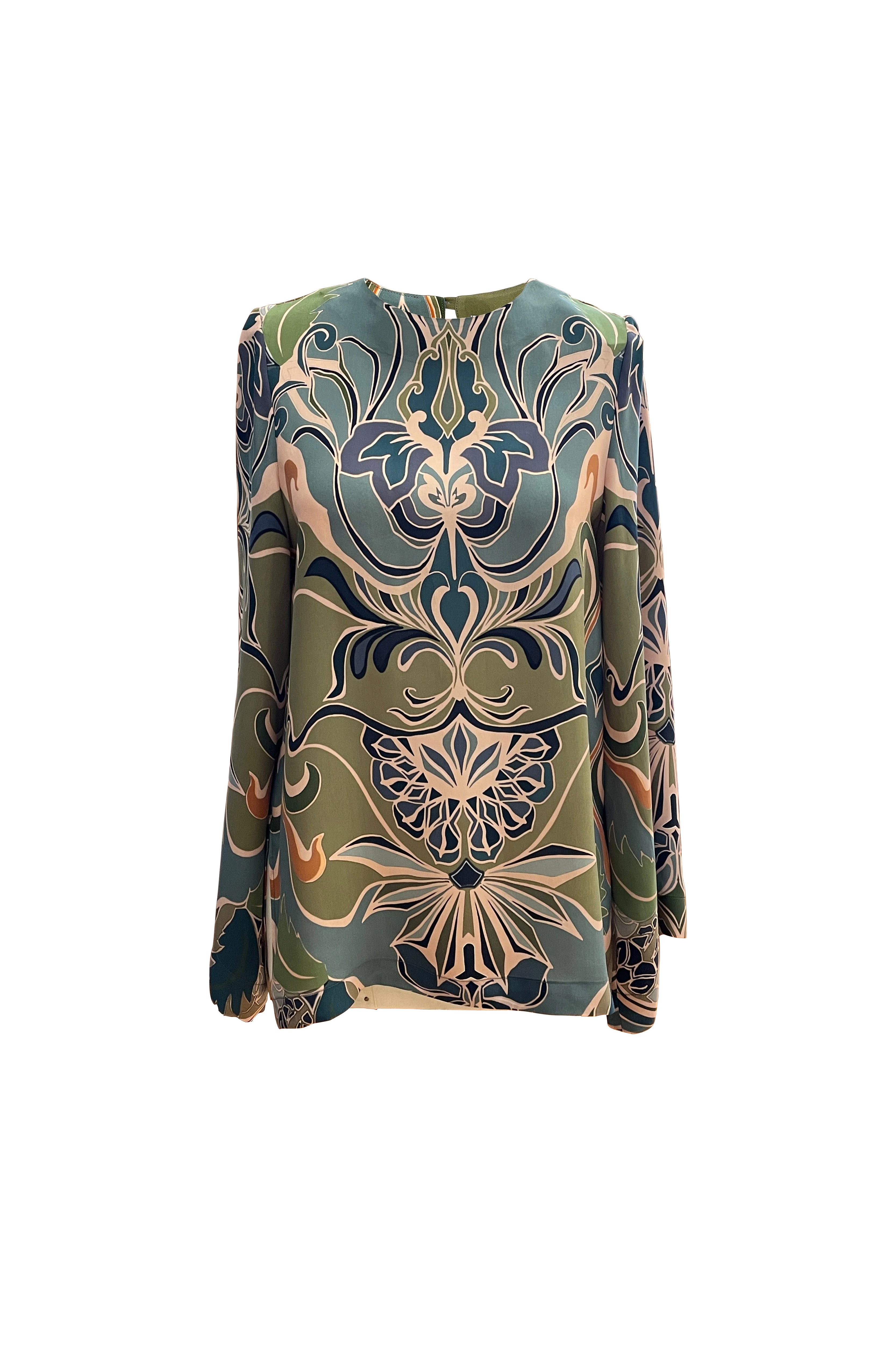 Artfully detailed and effortlessly elegant, this blouse brings a refined touch to any wardrobe. Crafted from a soft, fluid fabric, it features an intricate, symmetrical print in rich green and blue tones that creates a striking visual effect. Its relaxed silhouette, round neckline, and long sleeves offer both comfort and sophistication, making it a standout piece for any occasion.