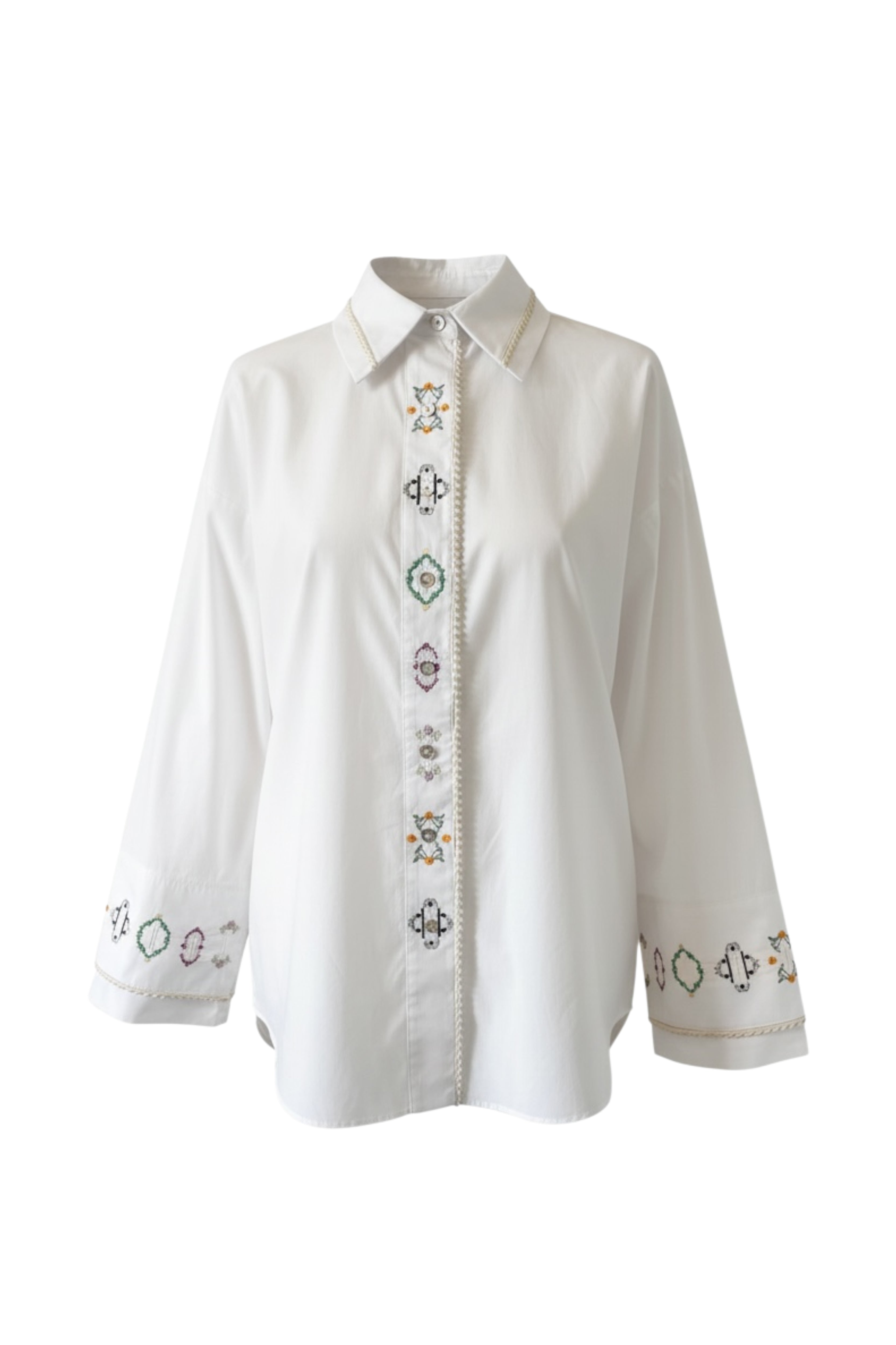 The Leona Shirt reinterprets classic shirting with refined embroidery and delicate detailing. Crafted from crisp cotton, this piece features colorful heritage-inspired embroidery along the placket and cuffs. The relaxed silhouette enhances comfort while maintaining an elevated, timeless look.